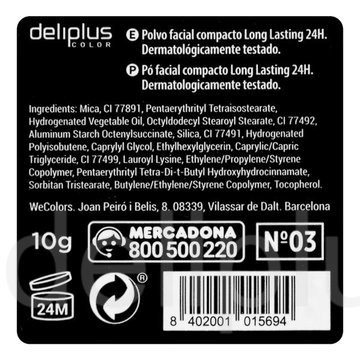 Компактна пудра 24H Long Lasting від Deliplus у відтінку 03 Dorado — це ідеальний фіксатор макіяжу для середньої та засмаглої шкіри. Відтінок 03 Dorado (золотистий) чудово підкреслює теплий підтон, надаючи обличчю здорового, сонячного вигляду. Формула Long Lasting забезпечує стійкість до 24 годин, що є незамінним для контролю жирного блиску в Т-зоні та підтримки матового фінішу. Пудра має дрібний помел, що дозволяє їй лягати невагомим шаром, не обтяжуючи макіяж і візуально згладжуючи пори. Може використовуватися для фіксації тонального крему або самостійно для легкого матуючого ефекту.