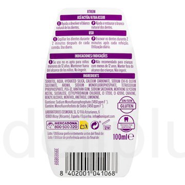 Deliplus Dentífrico 2 en 1 Xtrem — це інноваційний продукт для тих хто цінує максимальну ефективність та свіжість. Унікальна гібридна формула дозволяє засобу працювати одночасно як зубна паста та антибактеріальний ополіскувач. Завдяки вмісту Calcium Carbonate паста дбайливо видаляє поверхневе потемніння емалі повертаючи зубам їхній природний білий колір. Висока концентрація фтору (1450 ppm) забезпечує надійний захист від карієсу та ремінералізацію емалі. Рідша текстура допомагає активним компонентам проникати у важкодоступні міжзубні проміжки знищуючи бактерії та даруючи екстремально свіжий м'ятний подих на довгий час. Продукт не містить глютену та протестований провідними стоматологами Іспанії.